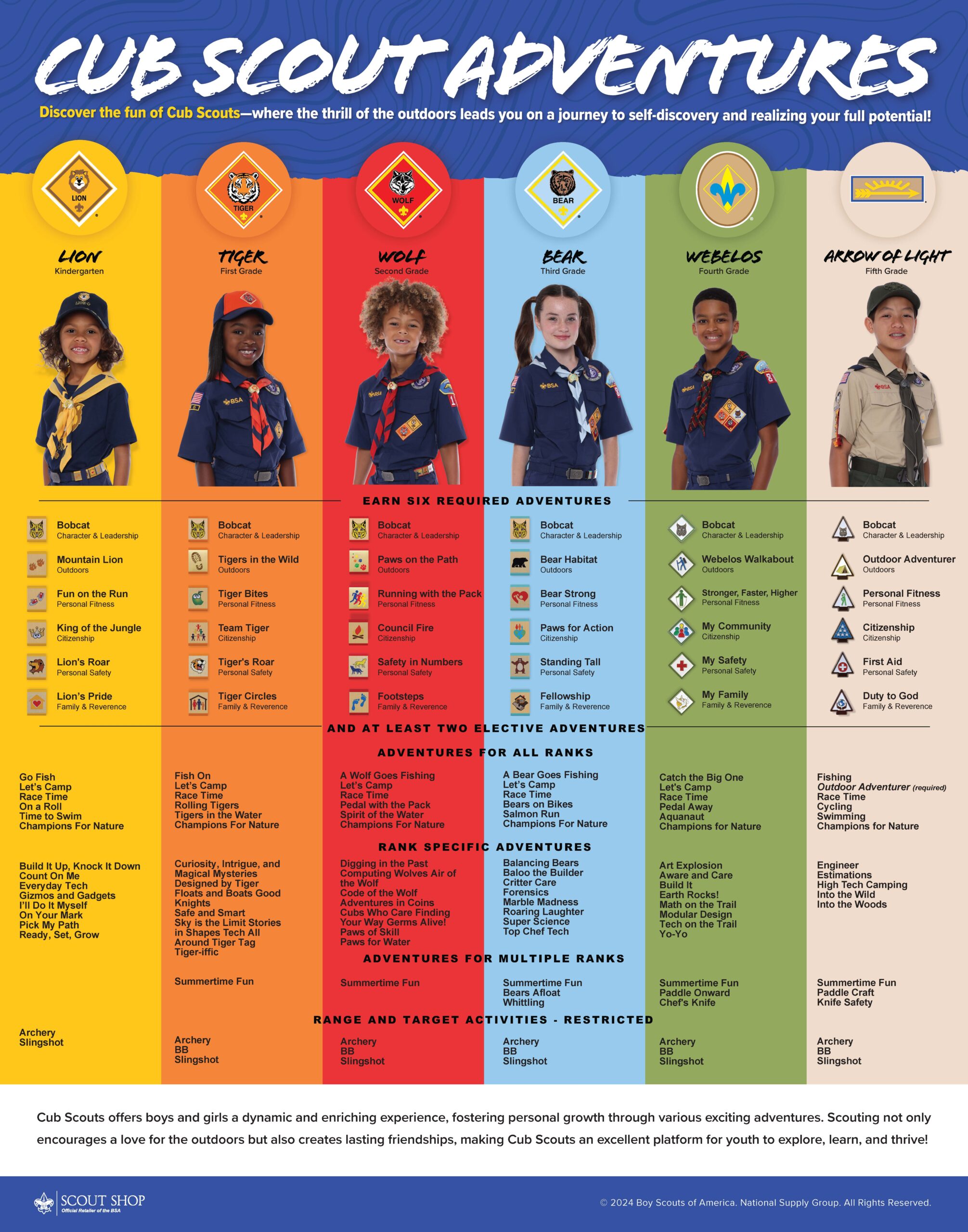 In life, leaders, experts, champions, and all those at the top of their field have one thing in common: Each started as a rookie. No one reaches the top without taking that exhilarating first step. Cub Scouts introduces kids to those important first steps, and there's something truly special about this stage. It's a time filled with wide-eyed excitement, boundless curiosity, and the courage to try new things. The thrill of setting up a tent for the first time, earning that very first badge, or making a new friend at the very first den meeting, these moments are electric, and they set the tone for a lifetime of growth.